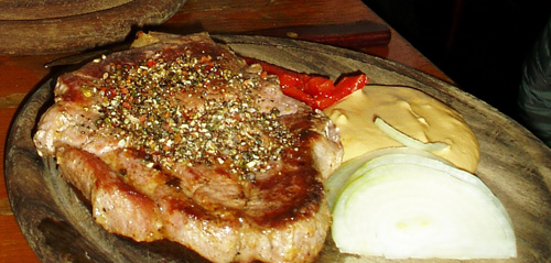 Кусок свиного мяса, приготовленный на гриле, обычно обильно приправлен смесью перцев.