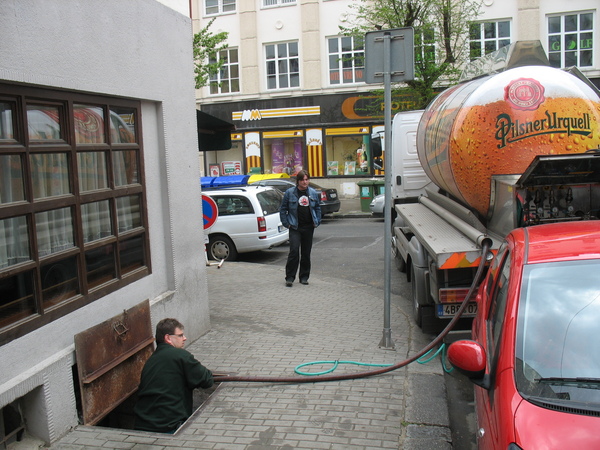 Привезли пиво! Ура! Из кабины вышел водитель, зашел в пивную поздоровался с наливальщиком. Вместе они вышли на улицу, наливальщик открыл ему подвал и вернулся за вычеп. В хвосте машины оказался целый пульт налива пива. Вот бы домой ко мне, так раз в неделю заезжали…. А дальше началась процедура под названием зарядка танка пивом. Пивные танки я видел не раз. А вот как их заправляют, видел первый раз.