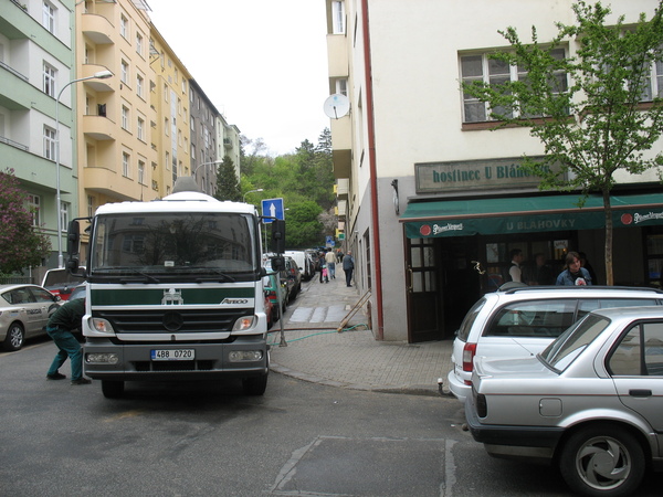 Водитель залез в подвал, подключил один из привезенных собой шлангов к водопроводу и начал промывать танки. Промывал он их минут пятнадцать. По одному шлангу в танк подавалась вода, по другому из него откачивалась. Затем мужик полез в подвал с большим куском полиэтилена, видимо карманом или пакетом. После чего опять начал колдовать со своими шлангами и пультом на машине. Видимо начал откачивать воздух из танка, а потом в танк полилось пиво. Весь процесс занял около часа.